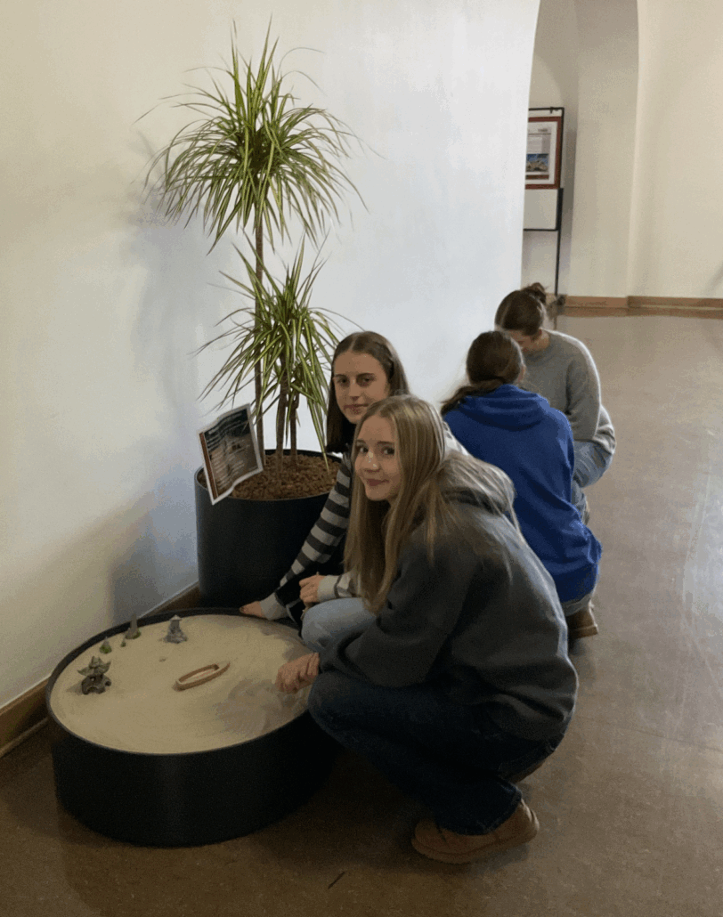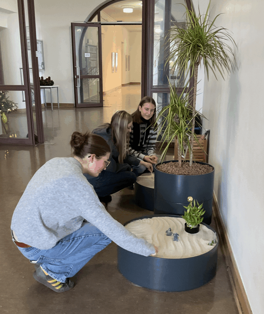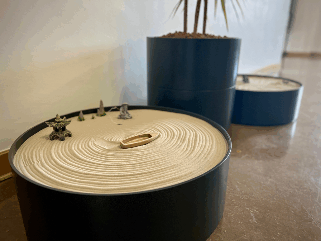 Der Zen-Garten ist bewusst offen gestaltet: Alle sind eingeladen, die Muster zu verändern, die kleine Sandlandschaft neu zu ordnen oder einfach nur die Atmosphäre auf sich wirken zu lassen.