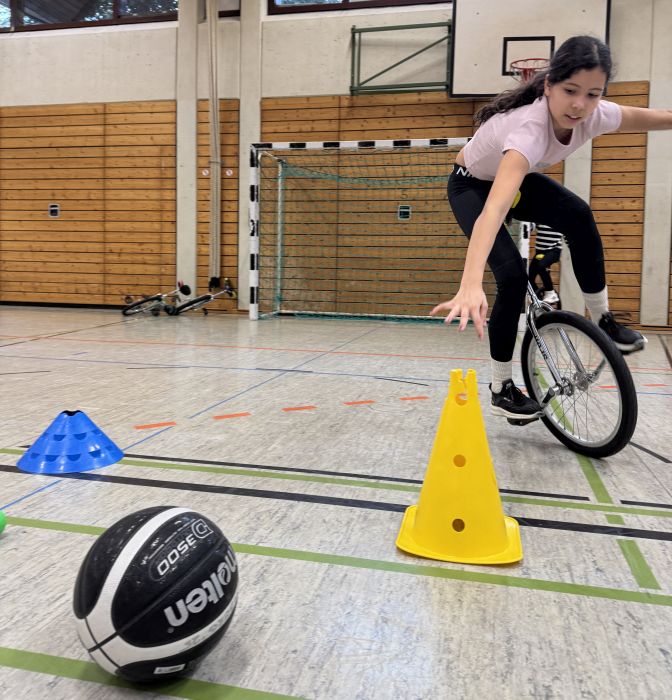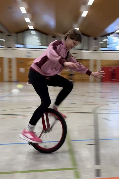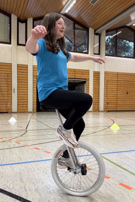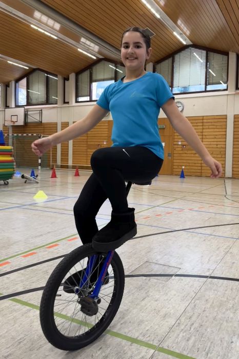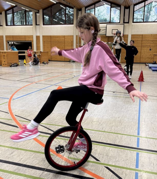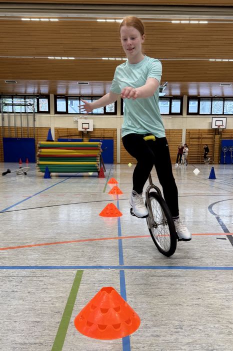 In der letzten Wahlfachstunde „Circus“ trainierten die Teilnehmenden für den Schulwettkampf Einrad, der am 24. Februar bei uns am Dalberg-Gymnasium stattfinden wird. Die Disziplinen sind der 50m-Sprint, das Slalom- und Achterfahren, das Aufheben von Gegenständen, das Langsamfahren, das Pendeln und das Springen. Einige Schülerinnen können jetzt sogar schon einbeinig pendeln. Bravo!