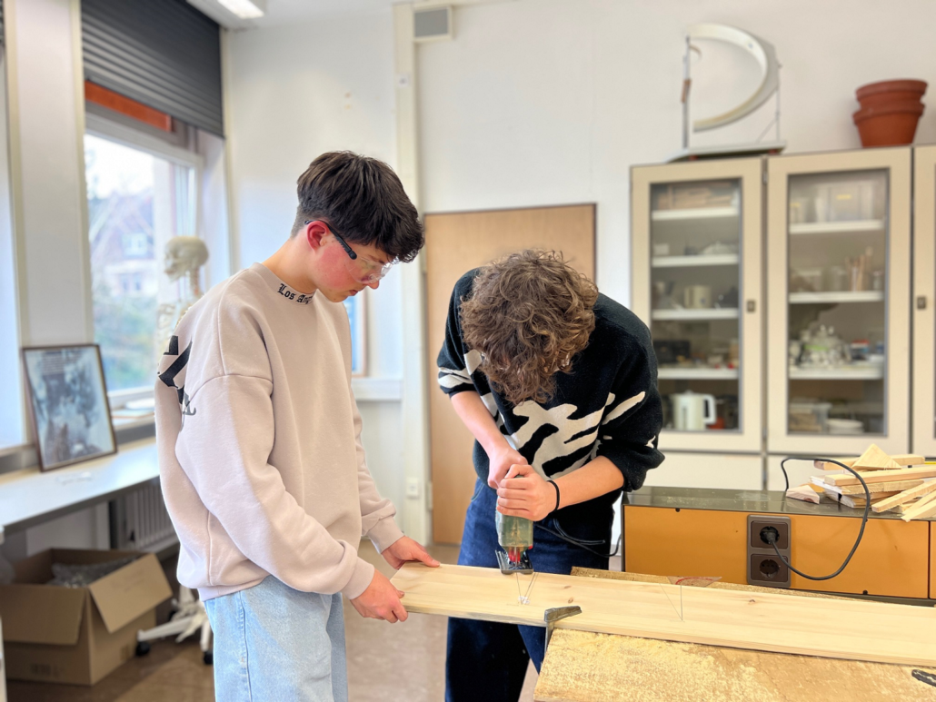Im Rahmen unseres P-Seminars Biologie begannen wir mit der Herstellung von zwei Nistkästen sowie eines Futterhauses. Dafür sägten wir die zuvor vorgezeichneten Formen sorgfältig aus Holz aus und schliffen sie anschließend ab. Zusätzlich stellten wir eigenständig Meisenknödel her. Das dafür benötigte Material konnten wir durch unseren Kuchenverkauf Anfang Januar finanzieren. Nach der Fertigstellung werden die Vogelhäuser und Meisenknödel an das Tierheim Aschaffenburg übergeben, wo sie den Vögeln in der Umgebung zugutekommen.
