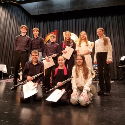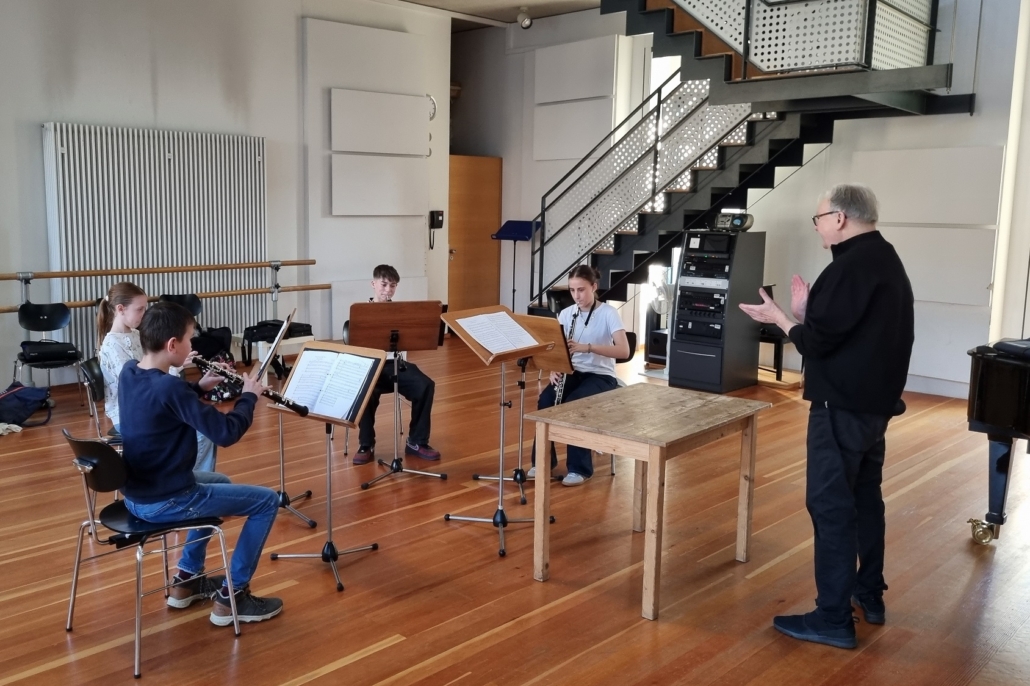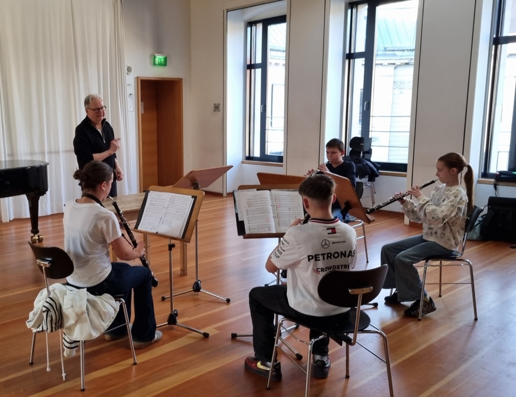 Als Vorbereitung fürs Frühjahrskonzert und den Landeswettbewerb „Jugend Musiziert“ war unser Oboenquartett heute an der Hochschule für Musik in Würzburg eingeladen. Dozent und Flötist Johannes Engels nahm sich sehr viel Zeit, coachte das Quartett mit unglaublicher Begeisterung, musikalisch sehr motivierend und natürlich wurde auch viel gelacht. Nicht nur der schwungvolle  Jungle Book Klassiker „Probier´s mal mit Gemütlichkeit“ sondern auch die vielen historischen Berichte zu G.F. Händels Wassermusik oder Elgars „Salut d´ amour“ machten die Arbeit kurzweilig.
