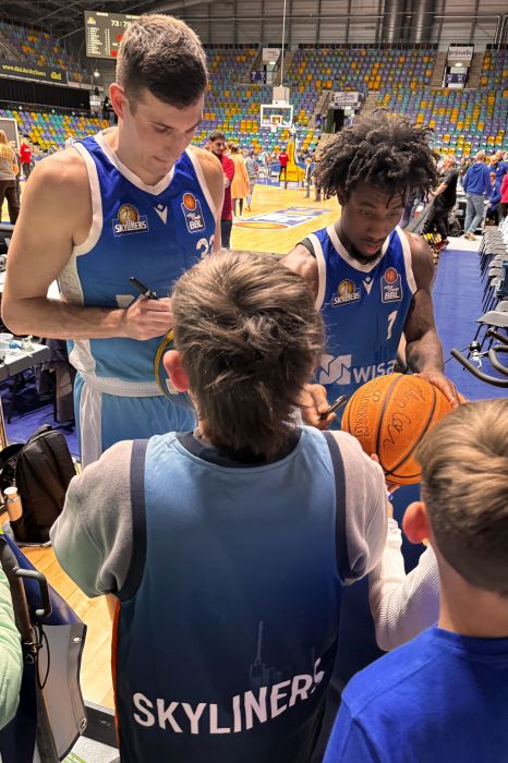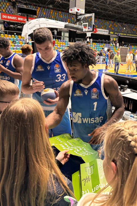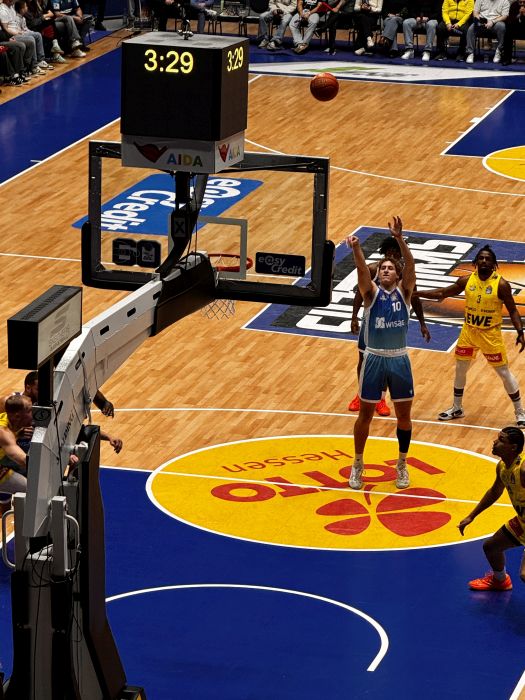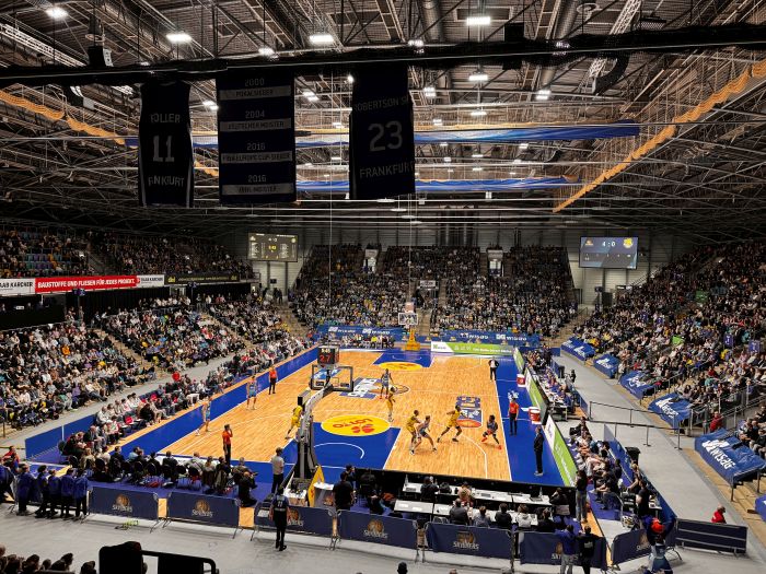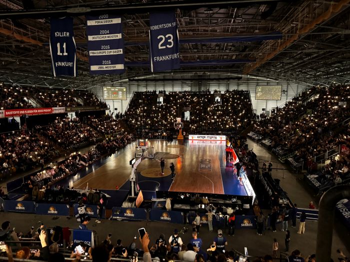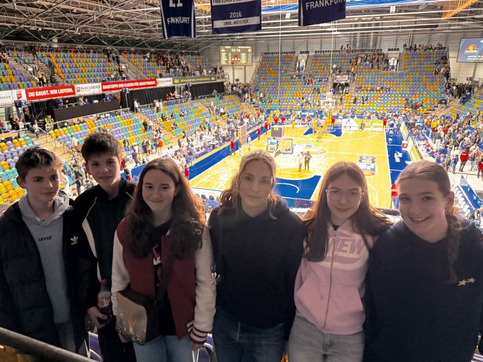 Rund 80 Mitglieder unserer Schulfamilie erlebten am Sonntag ein tolles und bis zur letzten Spielminute spannendes Basketballspiel. Dank vieler Freikarten und einer großen Anzahl günstiger Tickets besuchten wir das Bundesligaspiel der Frankfurt Skyliners gegen die EWE Baskets Oldenburg. Trotz lautstarker Anfeuerungen der Fans mussten sich die Skyliners am Ende leider mit 71:79 geschlagen geben. Für uns war es dennoch ein tolles Erlebnis, im Fanblock der Heimmannschaft die besondere Atmosphäre hautnah und live erleben zu dürfen.
