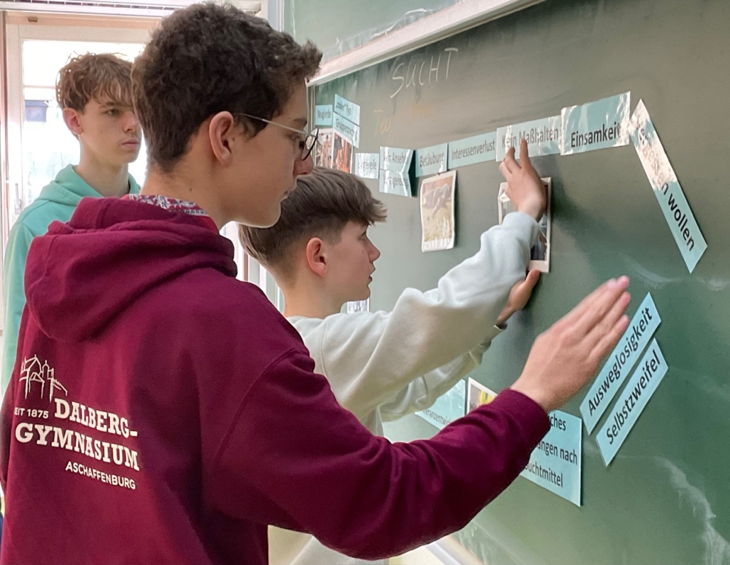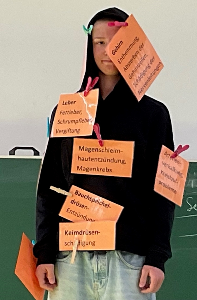 Die Klassen 8a und 8c setzten sich mit verschiedenen Formen der Sucht auseinander. Auf den gezeigten Bildern liegt der Fokus auf Alkoholismus. Mit Bild- und Textkarten wurde der Teufelskreis der Sucht erstellt. Verschiedene Meinungen konnten mit unterschiedlichen Kreidefarben dargestellt werden. So entstand ein Netz, das verdeutlicht, wie schwer ein Entkommen ist. Die Vielzahl der körperlichen Schäden wurde durch Anklammern der Textkarten über betroffenen Körperstellen verbildlicht. Im Abschätzspiel war der Alkoholgehalt in Getränken gefragt.