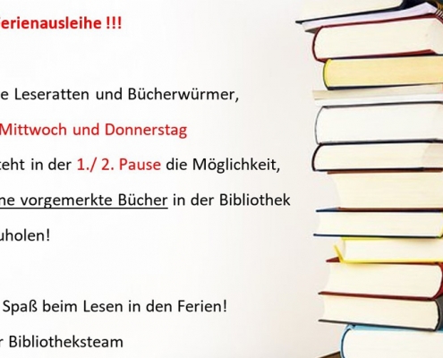 am Mittwoch und Donnerstag besteht in der 1./ 2. Pause die Möglichkeit, online vorgemerkte Bücher in der Bibliothek abzuholen! Viel Spaß beim Lesen in den Ferien! Euer Bibliotheksteam