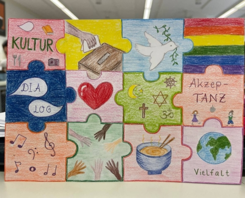 Die Klasse 9b/c-sprachlich unterstützt mit zahlreichen Motiven den Postkartenwettbewerb "Demokratie und Vielfalt" des Vereins "Wir für Aschaffenburg".