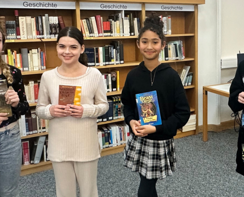 Eine Mutprobe, bei der ein Junge auf ein Dach klettern muss; Drachen, die eine unheimliche Gegend erkunden; eine chaotische Szene im Bus und ein Mädchen, das Gedanken lesen kann - mit diesen Textausschnitten erfreuten die vier Klassensiegerinnen Pauline, Franziska, Dior-Maria und Marla ihre Zuhörerschaft und die Jury beim diesjährigen Lesewettstreit in unserer schönen Bibliothek.