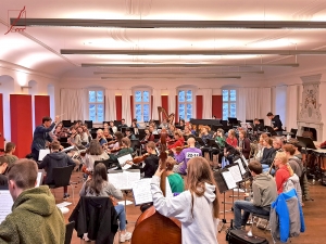 Über die kleine Brücke, vorbei an den vom Biber abgenagten Bäumen, eine Steigung über Kopfsteinpflaster hinauf bis zum in nächtlicher Stille liegenden Marktplatz, am Polizeiposten vorbei, durch das Tor mit der Inschrift 1679, den im Mondschein liegenden Schlosspark mit seinen steinernen Zwergen links liegen lassen, die schwere Tür aufziehen und … Stimmengewirr und fetzige Musik, die aus den Kellergewölben heraufsteigt! 190 ausgelassen feiernde Jugendliche und Musik vom Feinsten – nämlich selbst gemachte! Soweit zum Abschiedsabend, doch zurück zum Anfang der Probentage am 20. Januar.