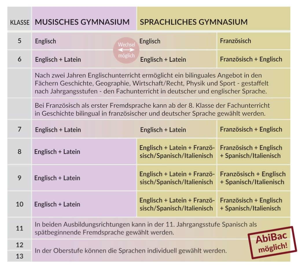 Ein Wechsel zwischen dem musischen und dem sprachlichen Gymnasium ist bei Englisch als erster Fremdsprache bis zum Eintritt in die 8. Jahrgangsstufe möglich.
